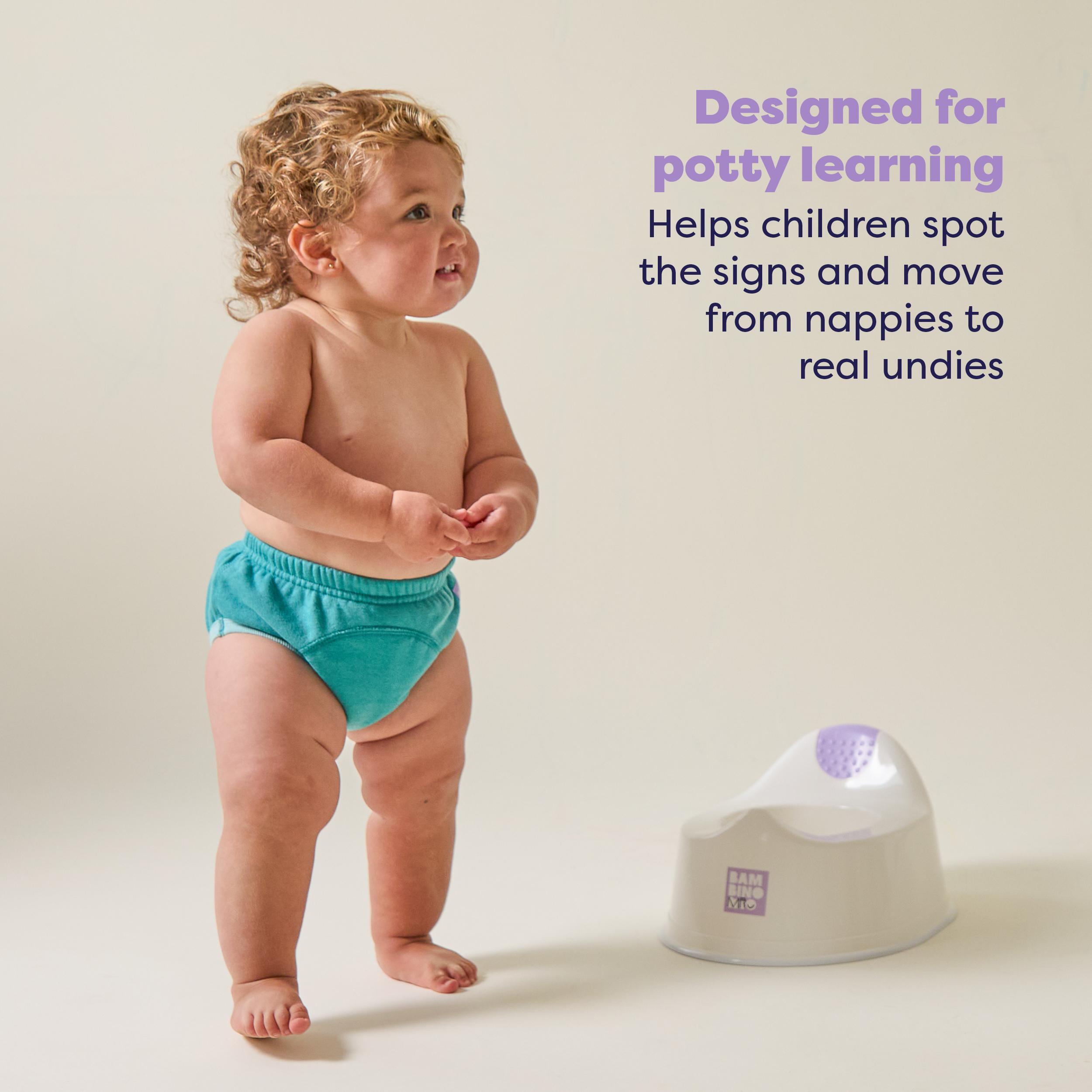 Bambino Mio® korduvkasutatavad potitreeningu püksid on loodud toetamaks väikelapse potitreeningut päevasel ajal. Erinevalt ühekordsetest mähkmetest võimaldavad need lapsel tunnetada niiskust, mis on kriitilise tähtsusega samm iseseisva hügieeni õppimisel.