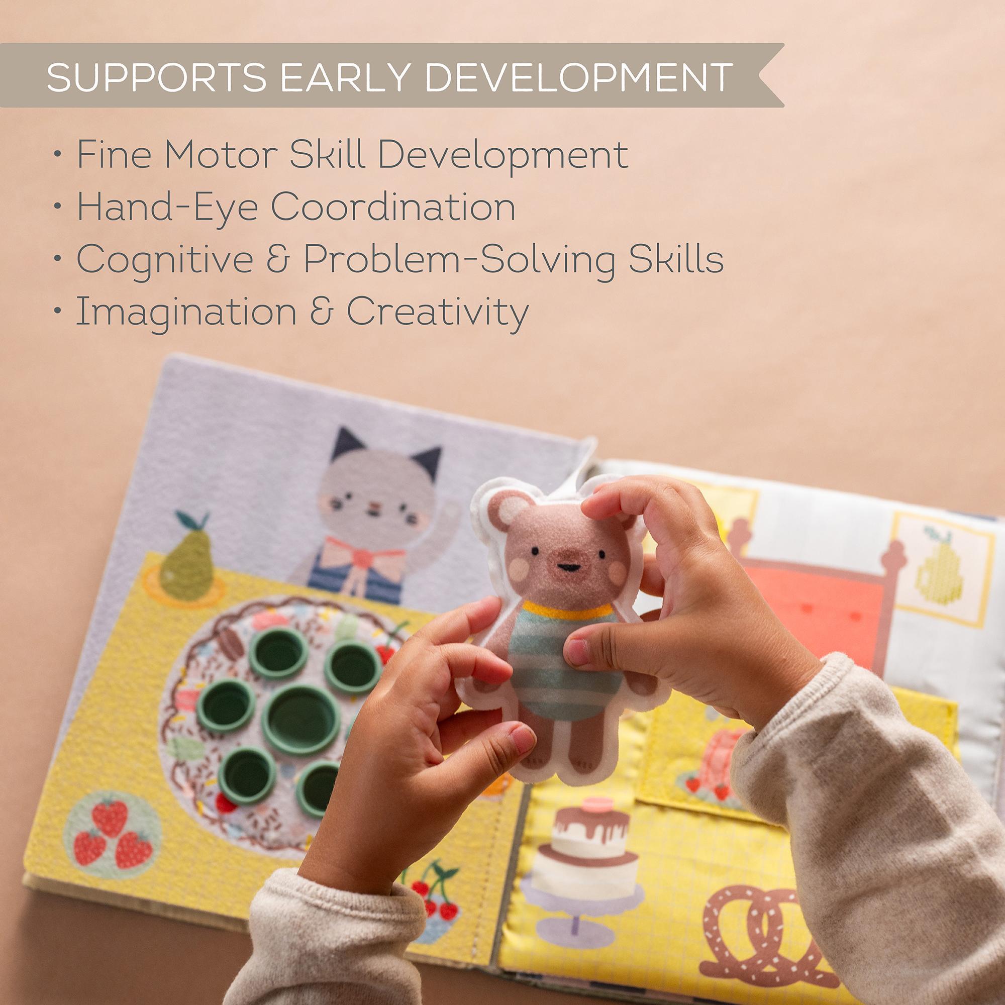 This soft, interactive busy book introduces toddlers to familiar daily routines, waking up, eating, bathing, and playing, through hands-on discovery.